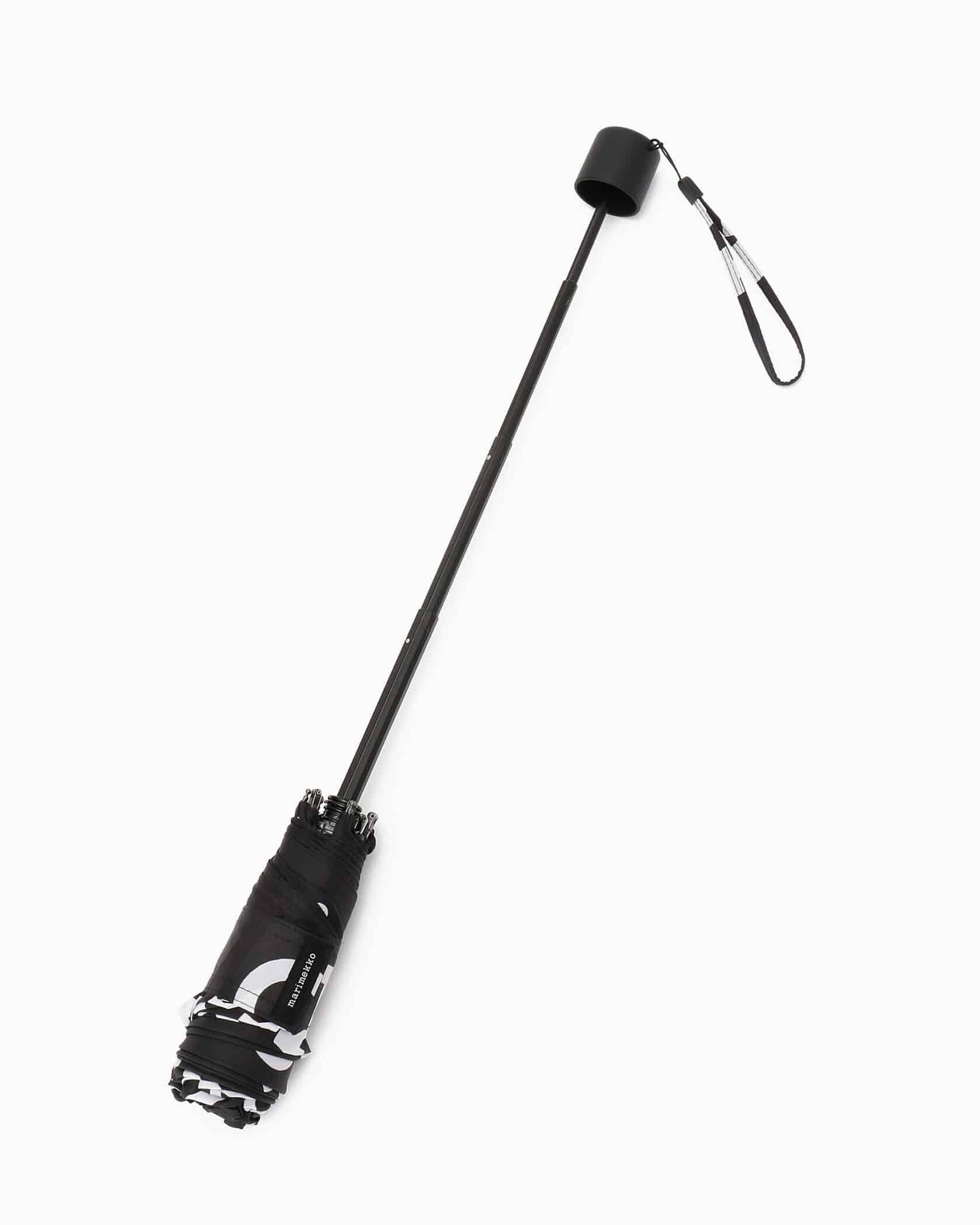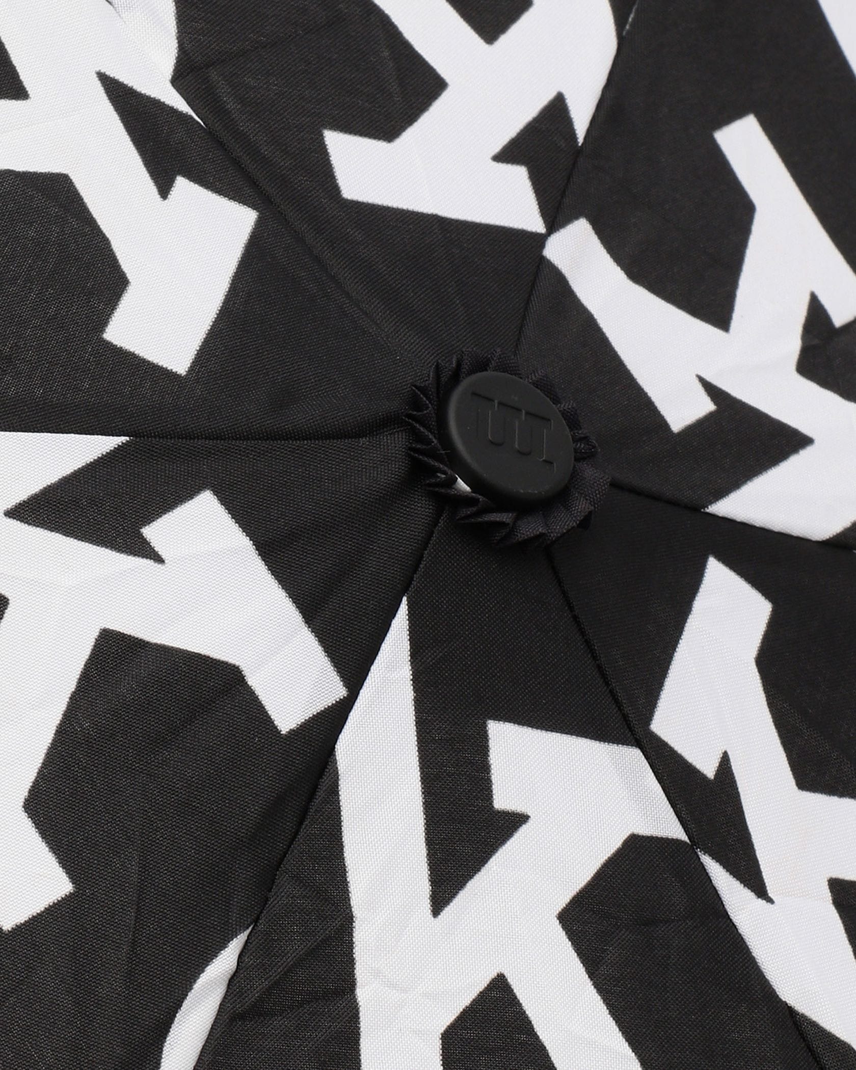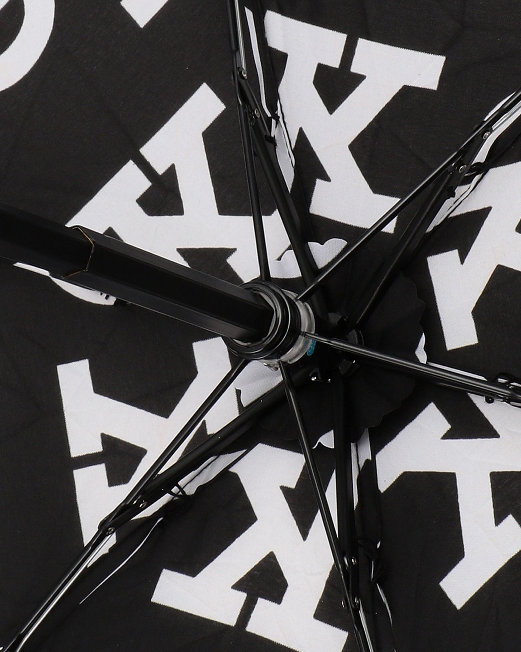 ブランドロゴが大きくプリントされた折りたたみ傘。ブラック×ホワイトでモードな印象に仕上げています。バッグの中でもかさ張らないスリムなフォルム。くるっとまとめやすいワイド幅のバンドが使いやすさのポイント。同柄の専用カバーつき。